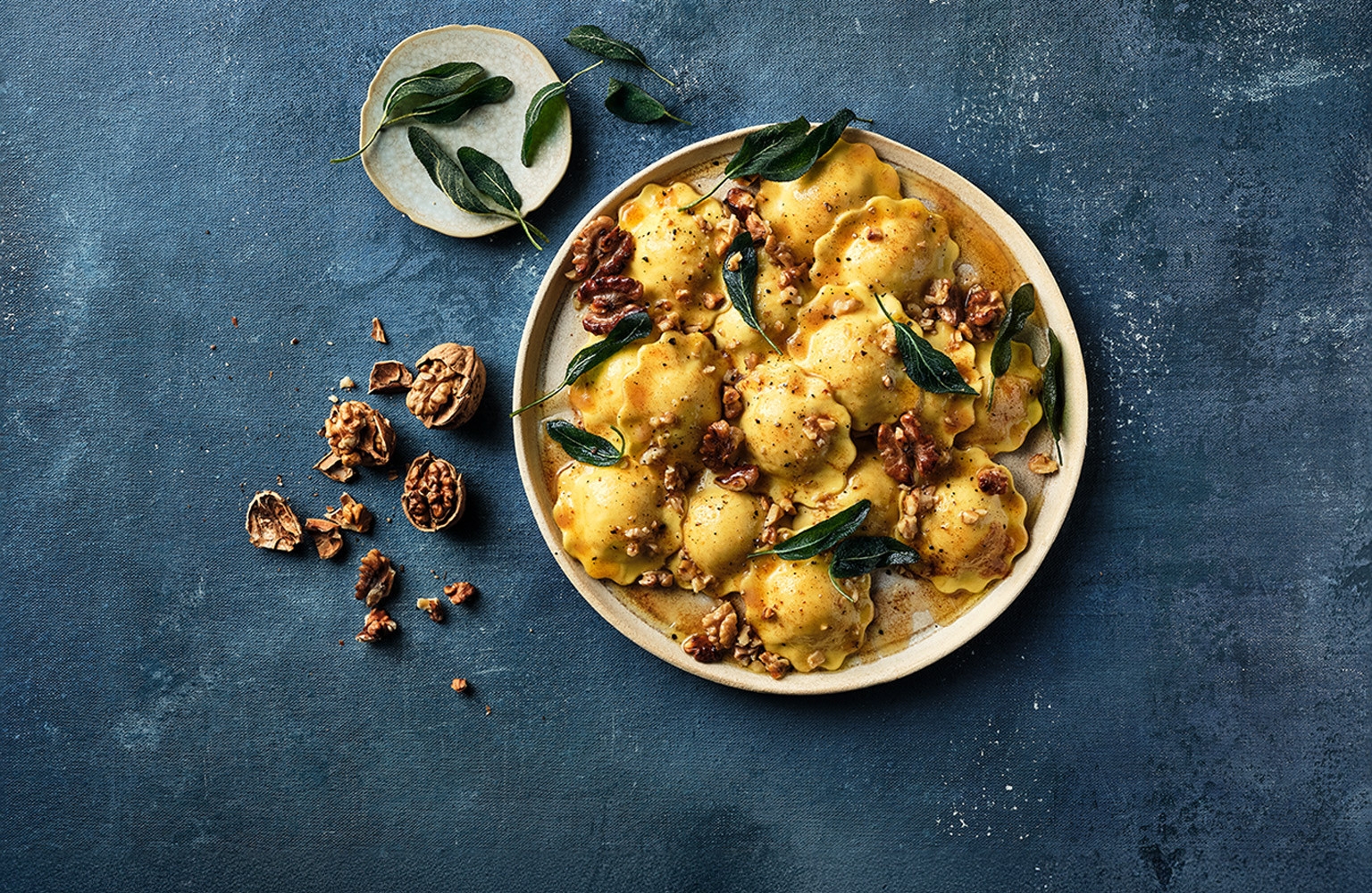 roasted cauliflower & cheese ravioli with toasted walnuts and fried sage