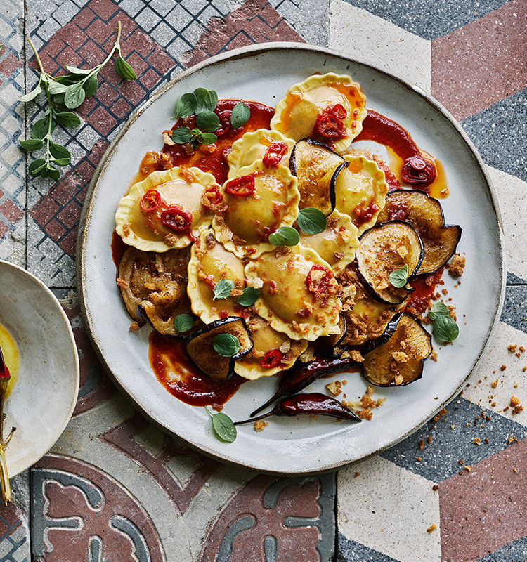 BURRATA AND ARRABBIATA RAVIOLI WITH BROCCOLI LEAVES