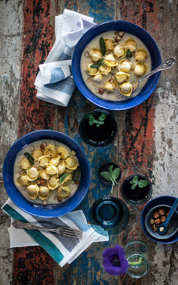 Cook the tortellini for 2 minutes in salted boiling water. Drain and plate up, topping with your melted cheese sauce, chopped hazelnuts and crispy sage leaves.