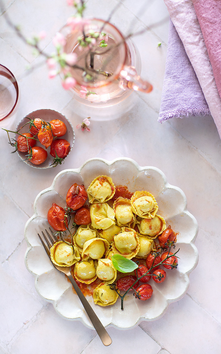 Cook the tortellini for 2 minutes in salted boiling water. Drain and serve, placing a vine of cherry tomatoes on each plate. Season with your herb oil.