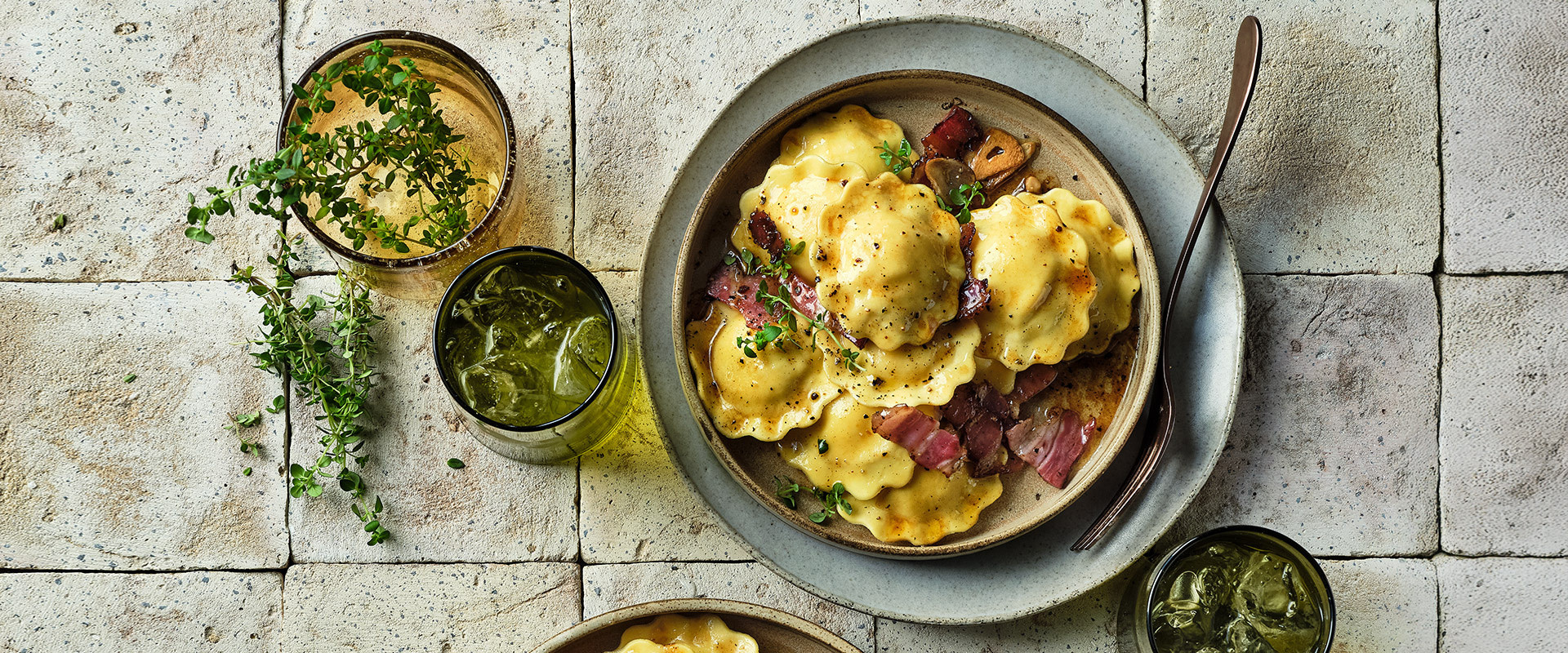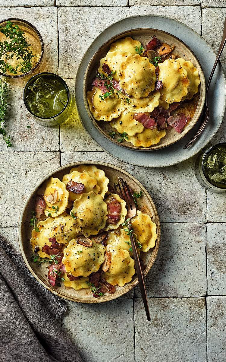 MUSHROOM RAVIOLI WITH GARLIC AND BACON