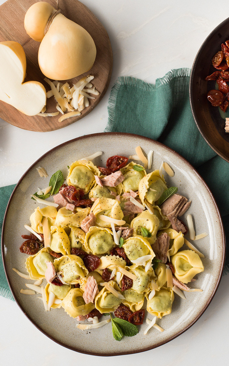 RICOTTA & SPINACH TORTELLINI WITH TUNA, DRIED TOMATOES, PROVOLONE CHEESE AND MINT