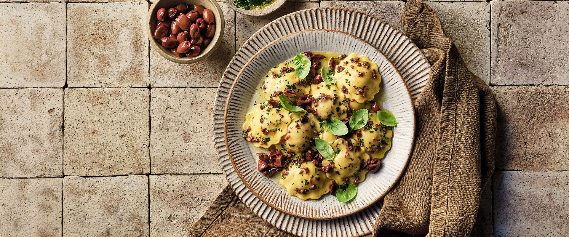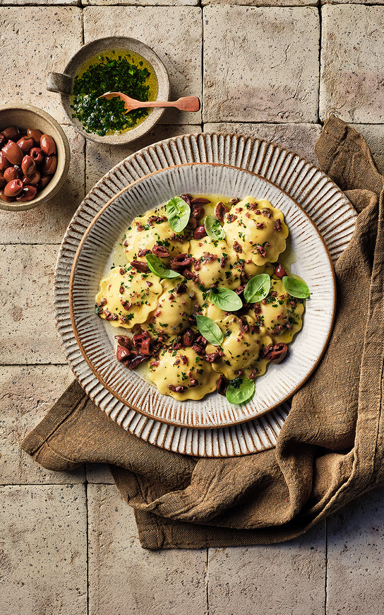 TOMATO, BURRATA & A HINT OF CHILLI RAVIOLI WITH OLIVES AND BASIL